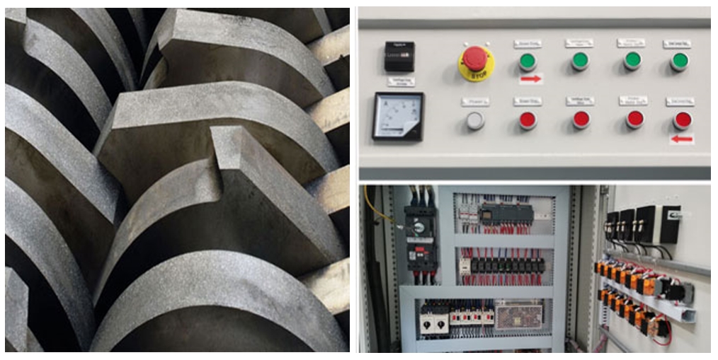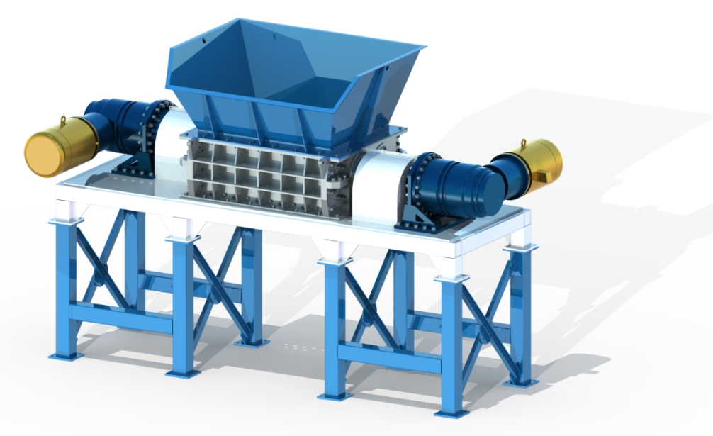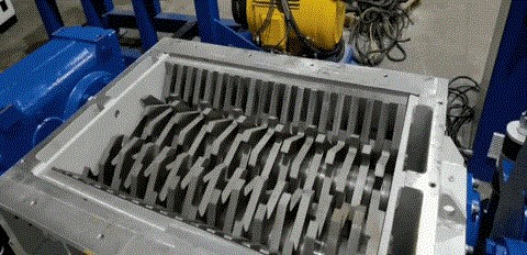 The double-shaft shredder is designed to deal with various garbage of different materials, like scrapped cars, tires, electronic waste, wooden trays. The geometry of the blade can be customized according to the material processed. Two reverse rotating shafts with special design blades and the spacing comb between the blades and connected to the inner wall of the shredder, greatly cut the material into flakes.