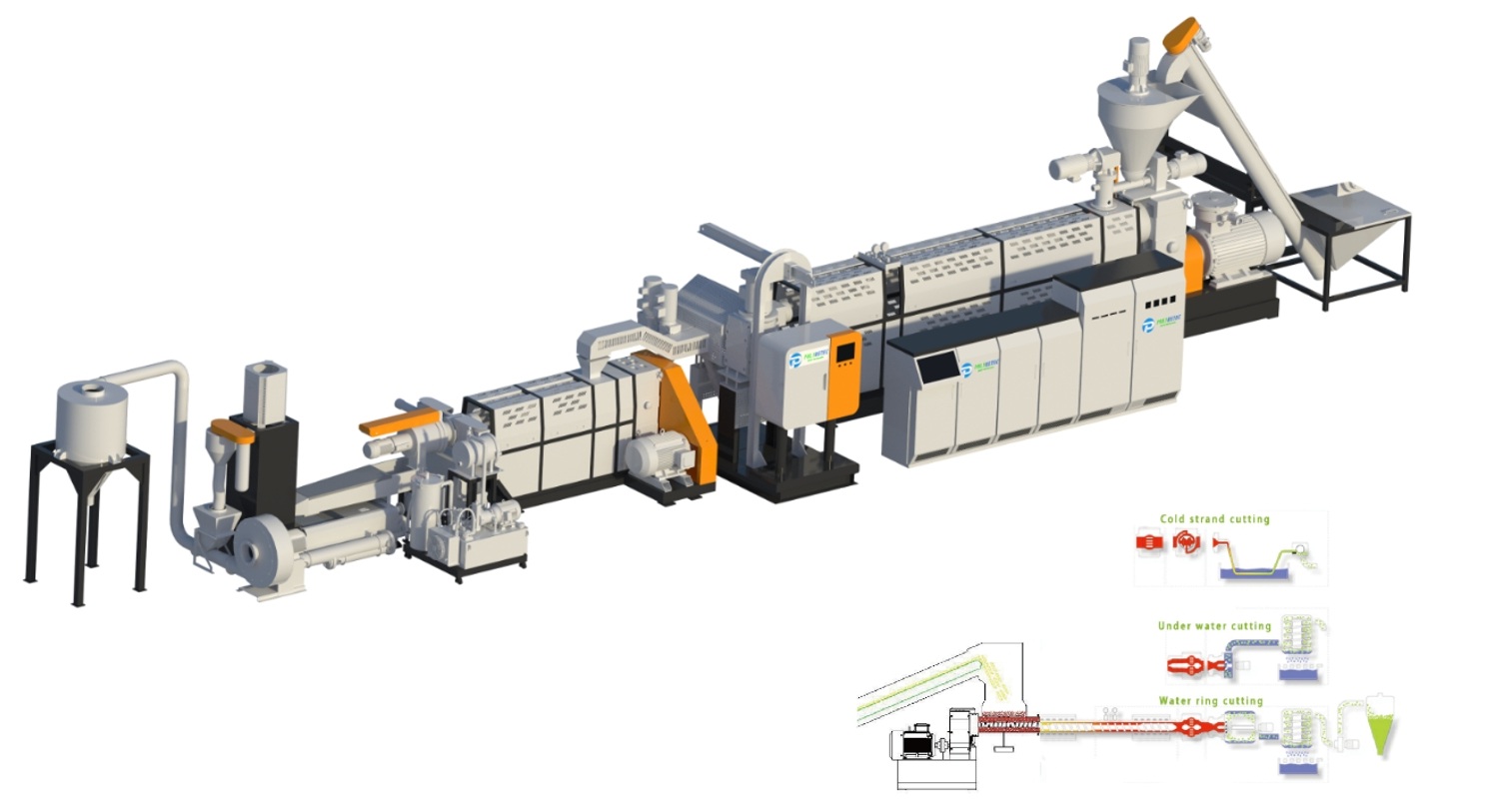 Pelletizing way: water-ring cutting, cold strand cutting, under water cutting all available meet different conditions of materials. Below use water-ring cutting as an example.