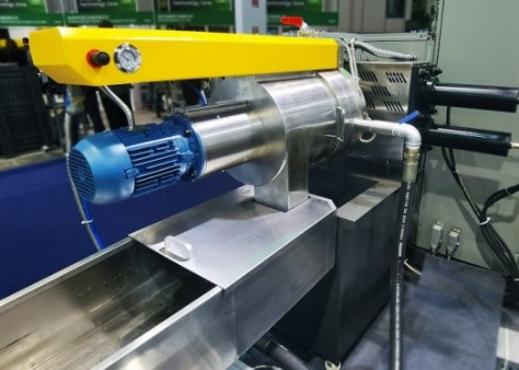 Process: screw loader, extruder, pelletizing unit, water cooling unit, drying unit, storage silo.