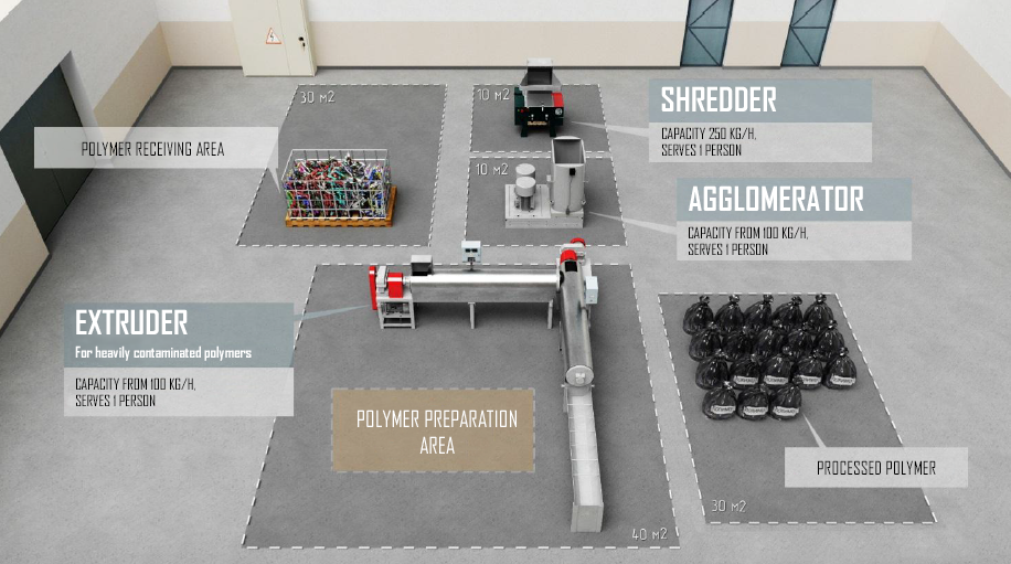 • Extruder (capacity: from 100 kg/h) for heavily contaminated polymers. Operated by 1 person.