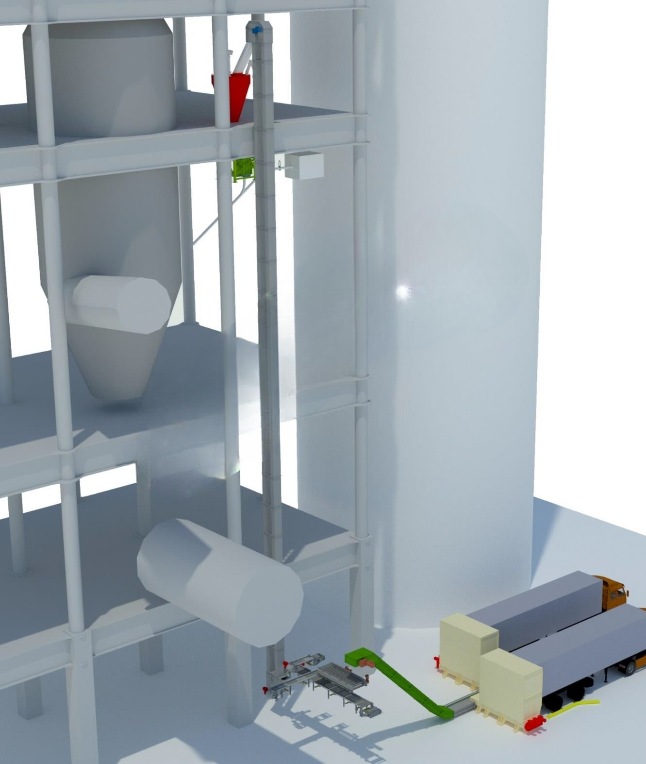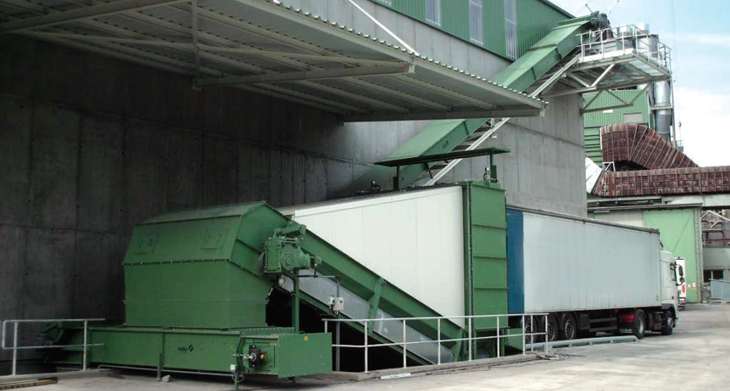 The DOC station for receiving alternative fuel (delivered by chip trucks) has a capacity of 1 to 20 tons per hour. An option for "operation from wheels" is possible, where the chip truck serves as operational storage. Two to three DOC stations can be installed on one collection conveyor. Functions of the DOC station:
