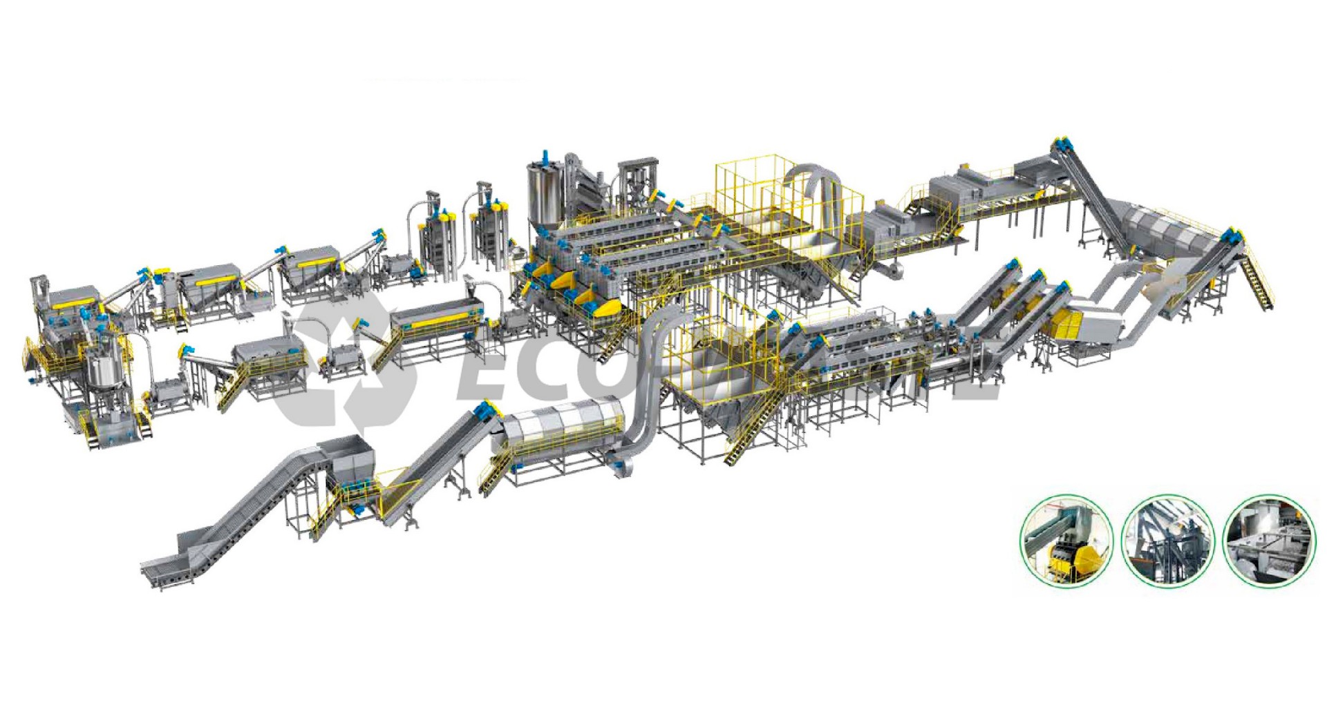De-baling→Metal Removal-→Label Removal--→Metal Removal--→Bottle Pre-washing→Optical Bottle Sorting→Manual Sorting→Crushing→Dust Removal-→Flotation Hot washing→Friction Washing→Rinsing→Flushing