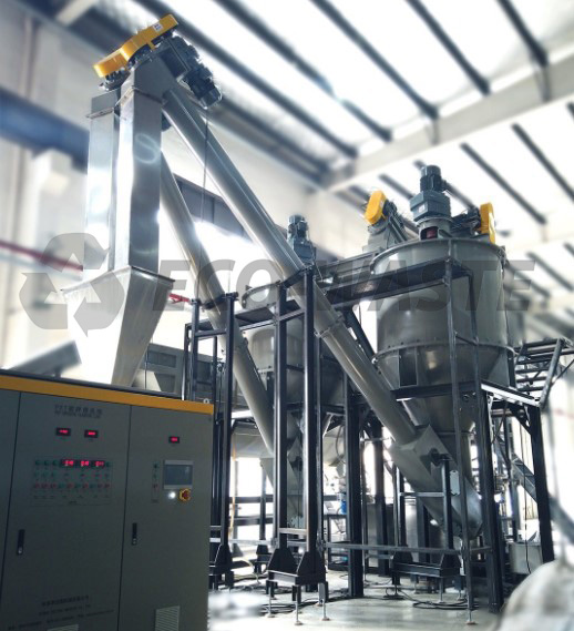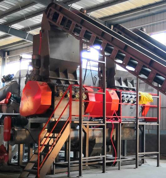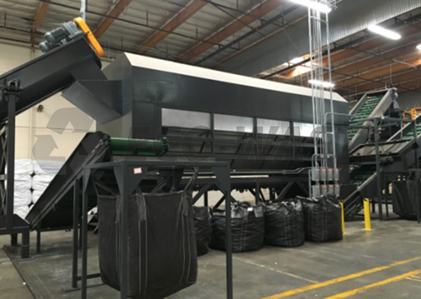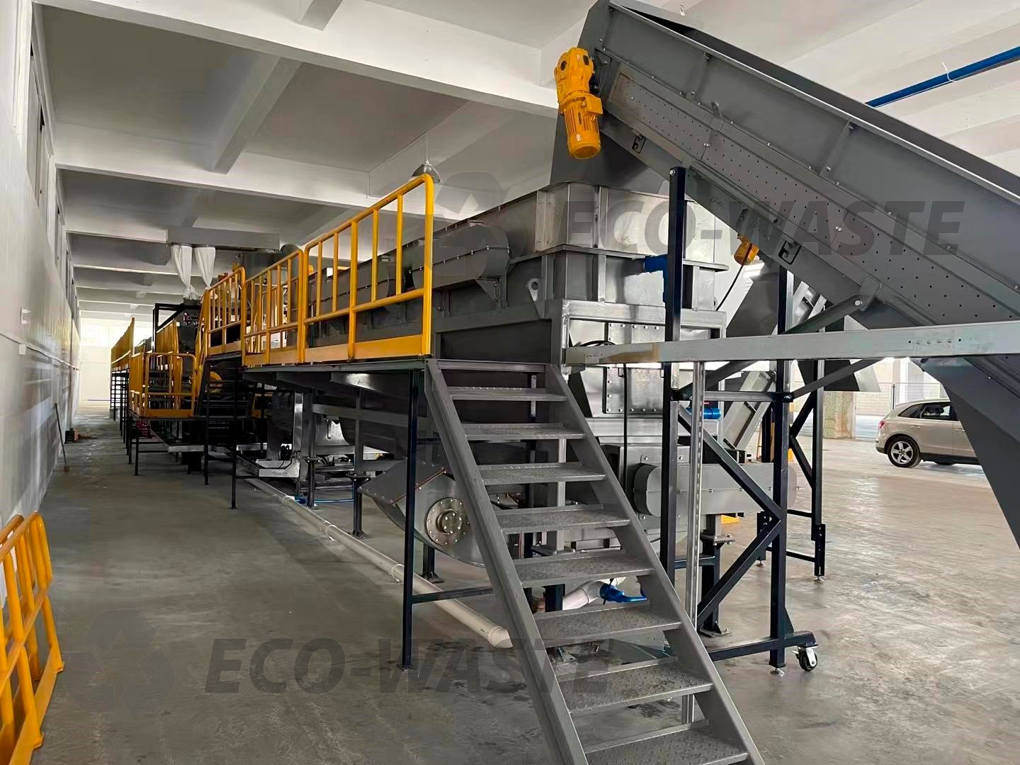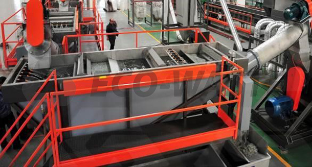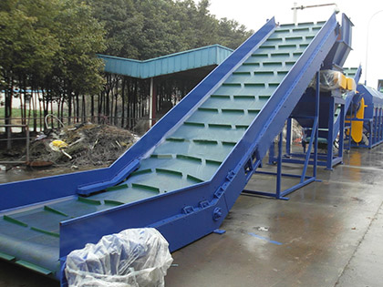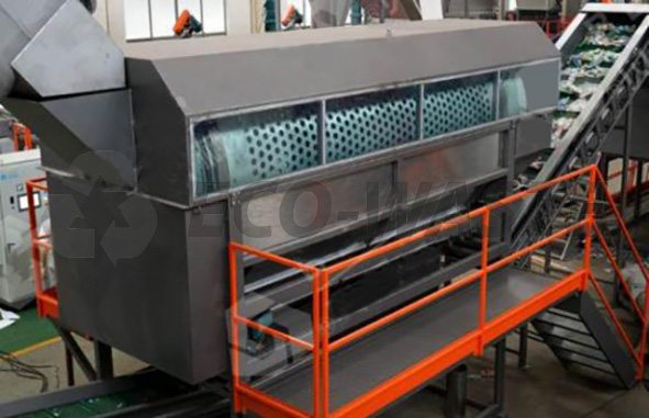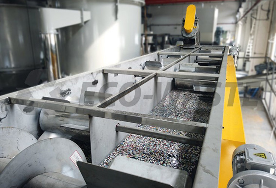 Pre-washer. It aims to wash away the dirt and adhesive labels on the surface of bottle scraps that are delivered to the washing machine after being scattered by the unpacking machine with high-temperature agentia to and deliver the washed bottles to the next process with the double screw.