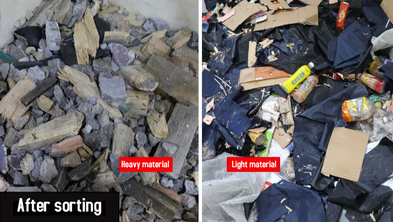 The main structure of the air separator includes: a feed conveyor, a rotating drum, a fan, a heavy materials conveyor, a fan separator, a settling chamber, a light materials conveyor, and a dust filter.