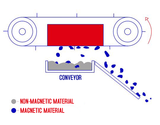 A self-cleaning overhead magnetic separator (suspended magnet) designed for extracting large ferrous metal inclusions from a stream of municipal solid waste (MSW) moving on a conveyor.