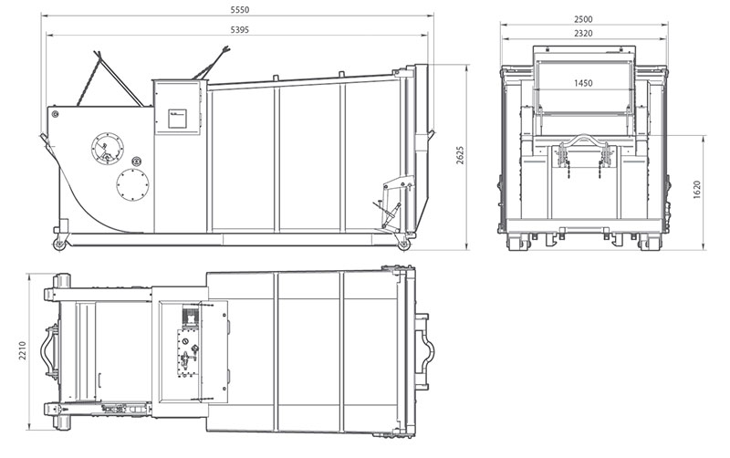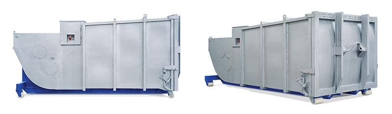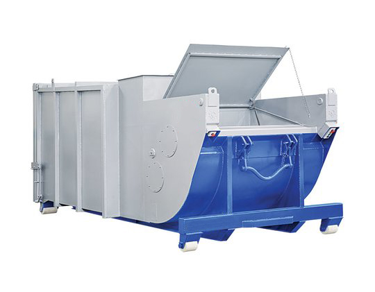 Container Baler MP-16V is a monoblock compactor (container press) designed for baling mixed wet (organic) waste in the residential and commercial real estate sectors, as well as in food production facilities. Its sealed, compact design isolates waste from the environment and reduces hauling costs several times over. Waste is compacted directly inside the container by a pendulum press platen with an electro-hydraulic drive. The compression ratio ranges from 1:3 (for food waste) to 1:10 (for PVC film and textile waste), depending on the material type.