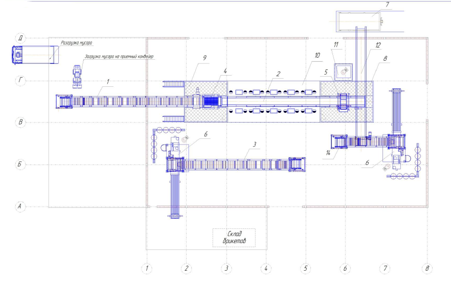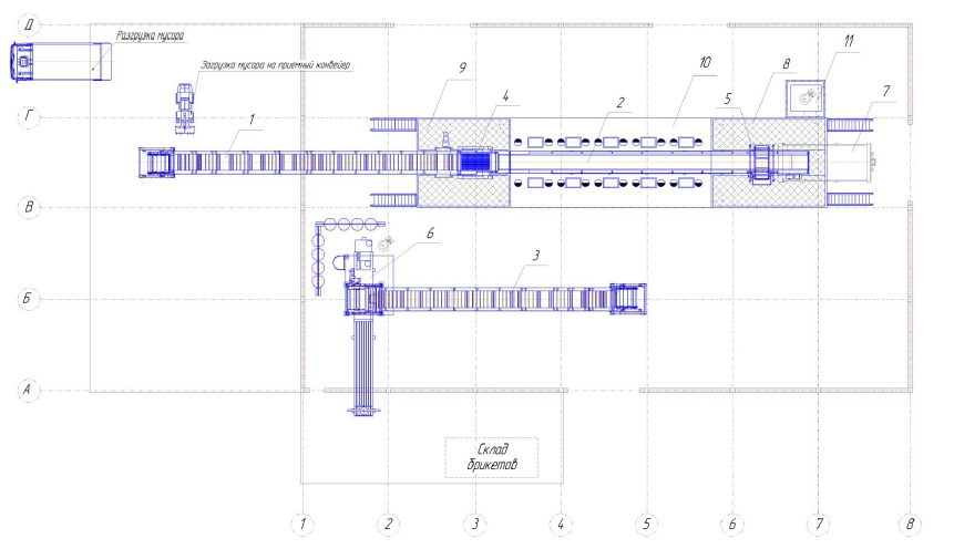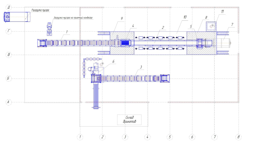 Применяется для станций, расположенных на незначительном удалении от полигона захоронения, расстояние до 1км. Бункер – накопитель позволяет заполнять контейнер без остановки линии. Время наполнения бункера – накопителя до 10-15 мин. Также отводящий конвейер поз.7 может выполнять функцию накопителя.